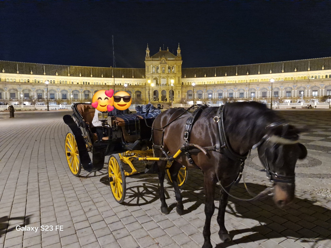요금은 50유로, 세비야 대성당에서 출발해 스페인 광장(Plaza de España)까지 이동하는 코스였습니다. 1명이 타든 4명이 타든 요금이 동일하기 때문에, 일행이 많을수록 1인당 부담은 크게 줄어듭니다. 저희는 여럿이 함께 탔기 때문에 가격이 꽤 합리적이라는 생각을 했습니다. 야경을 배경으로 스페인 광장에 진입하는 그 장면은 지금도 뚜렷하게 기억에 남습니다.